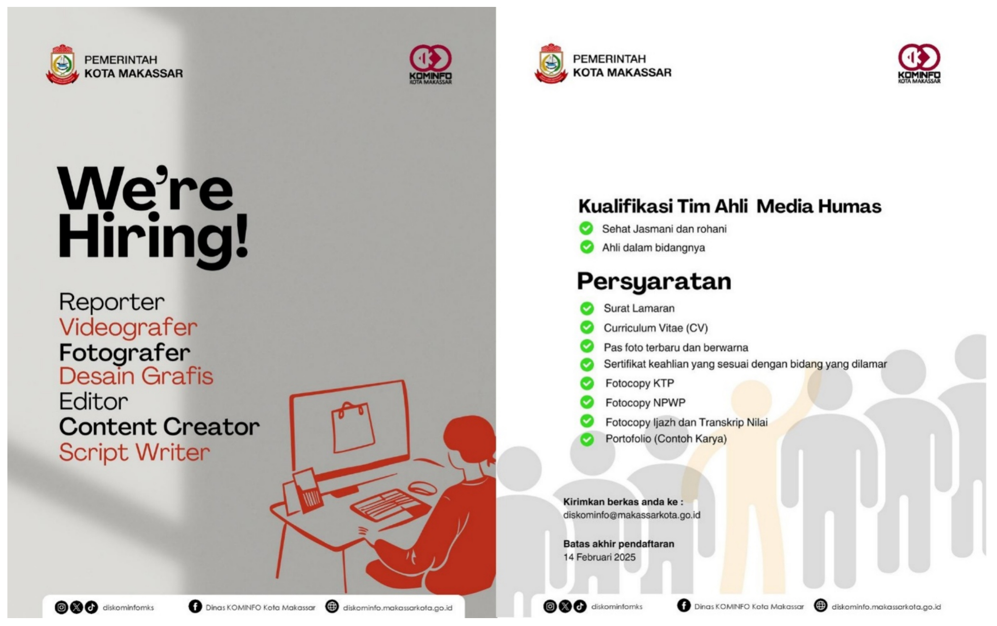 We’re hiring. Dinas Kominfo Kota Makassar membuka kesempatan bagi profesional
